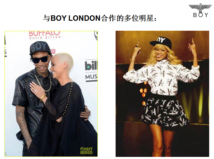 BOY LONDON是1960年代后期位于英国伦敦西南部的切尔西地区的英皇鉴于1976年由STEPHANERAYNOR设立的品牌。受到MCLAREN与维维安·韦斯特伍德的seditionaries(初期vivienneWestwood的店)的影响,开始了朋克之路。80年代BOY LONDON独特的前卫风格与鹰图案风靡一时。